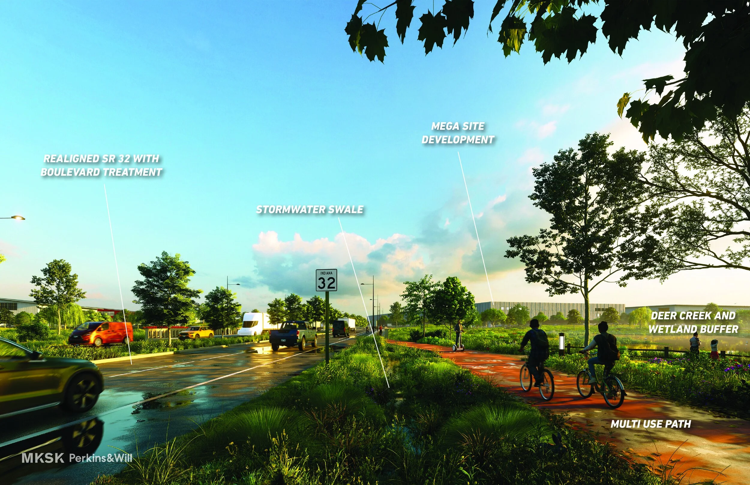 A rendering of a major corridor connecting the mega-site developments to I-65.