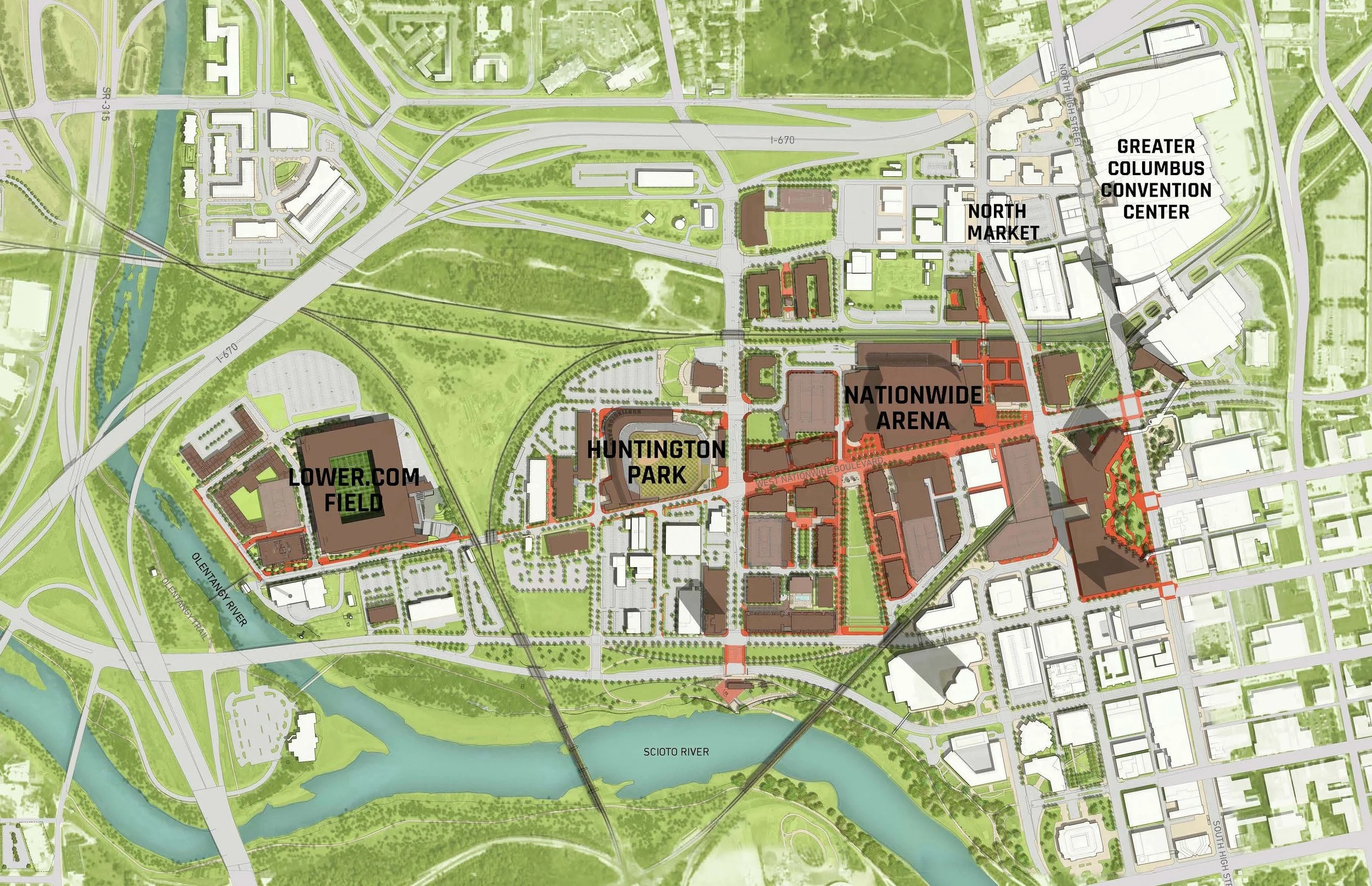 Celebrating its 25th anniversary, the Arena District Master Plan transformed a once-neglected area of Downtown Columbus into a nationally recognized model for mixed-use, anchor-district development—revitalizing the urban core with vibrant public spaces, green infrastructure, and a thriving mix of residential, commercial, and civic life.