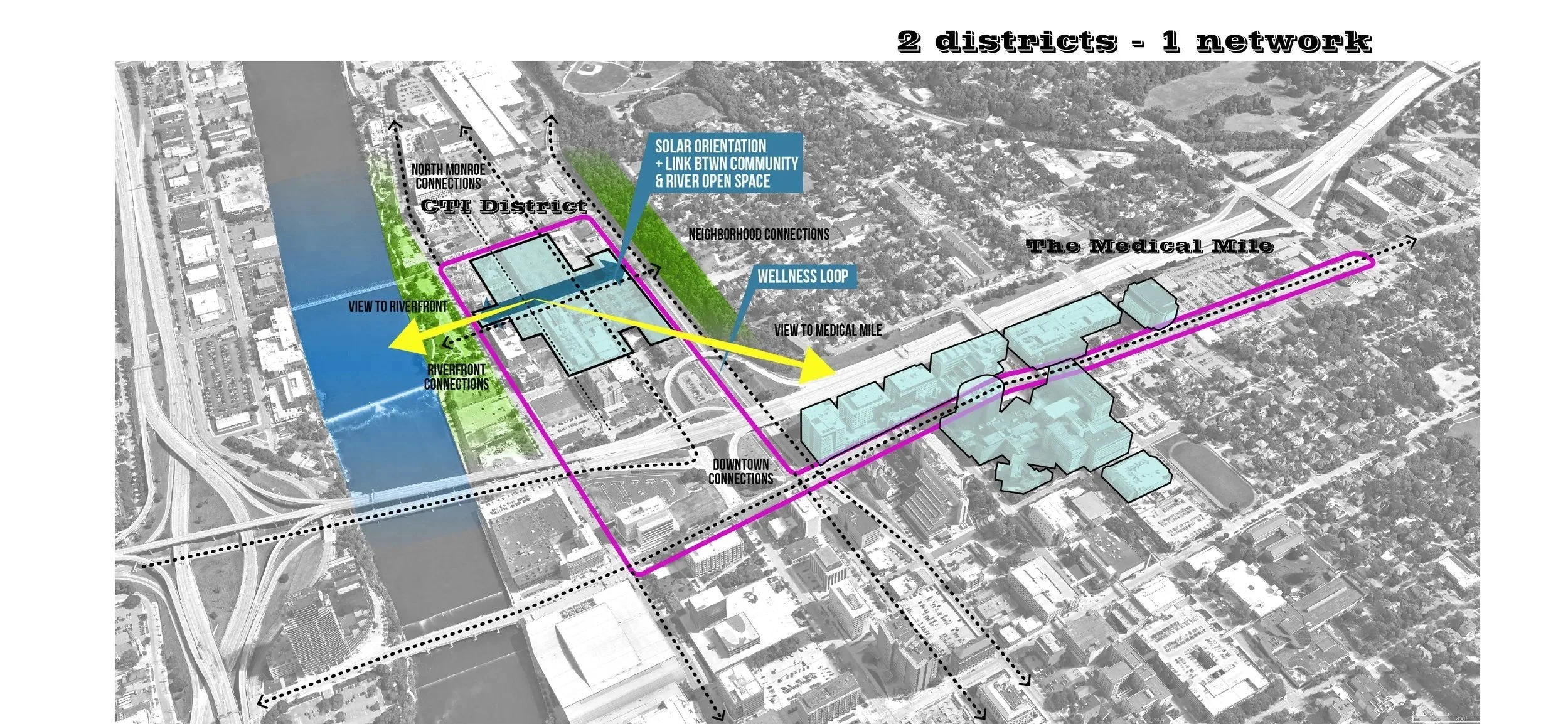 It also enhanced connectivity within the surrounding district, neighborhoods, and the adjacent Grand River riverfront. This district approach provides recommendations that addressed resilient design including floodplain management, urban head island impacts, solar orientation, and alternative means of transportation.