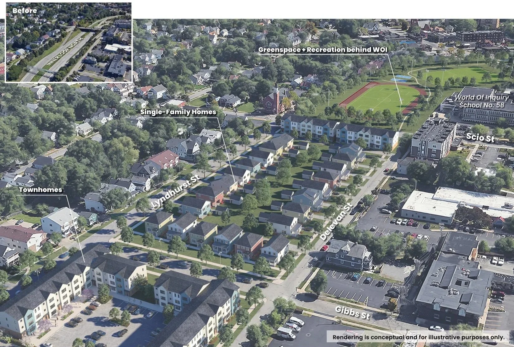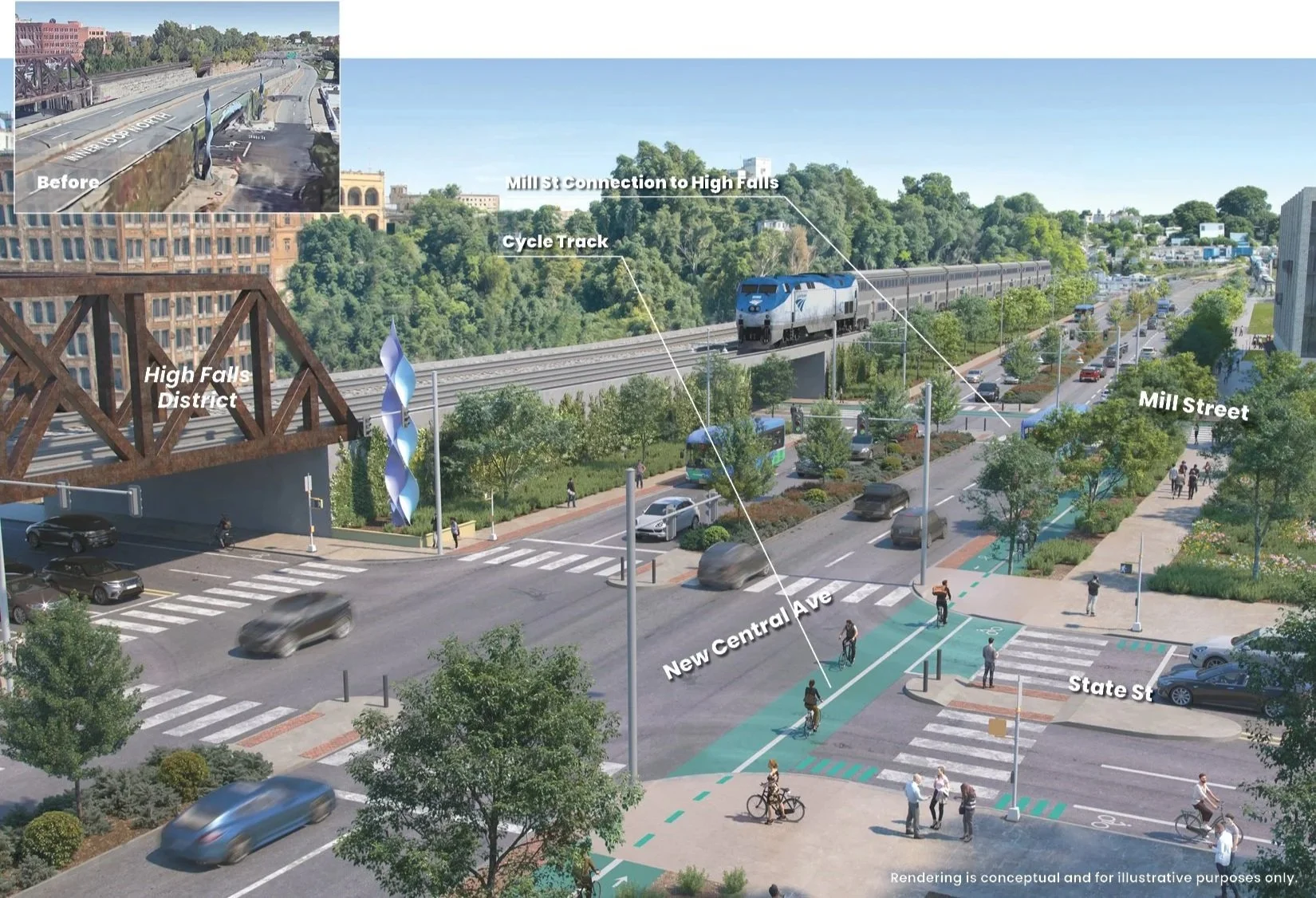 The Inner Loop North freeway is the remaining portion of Rochester’s downtown circulator highway that is subject to be removed, reclaiming more than 30 acres for downtown neighborhoods, a reconnected urban fabric, and long-term revitalization over the next several years.
