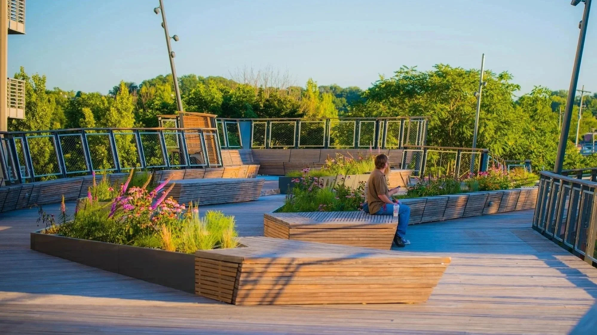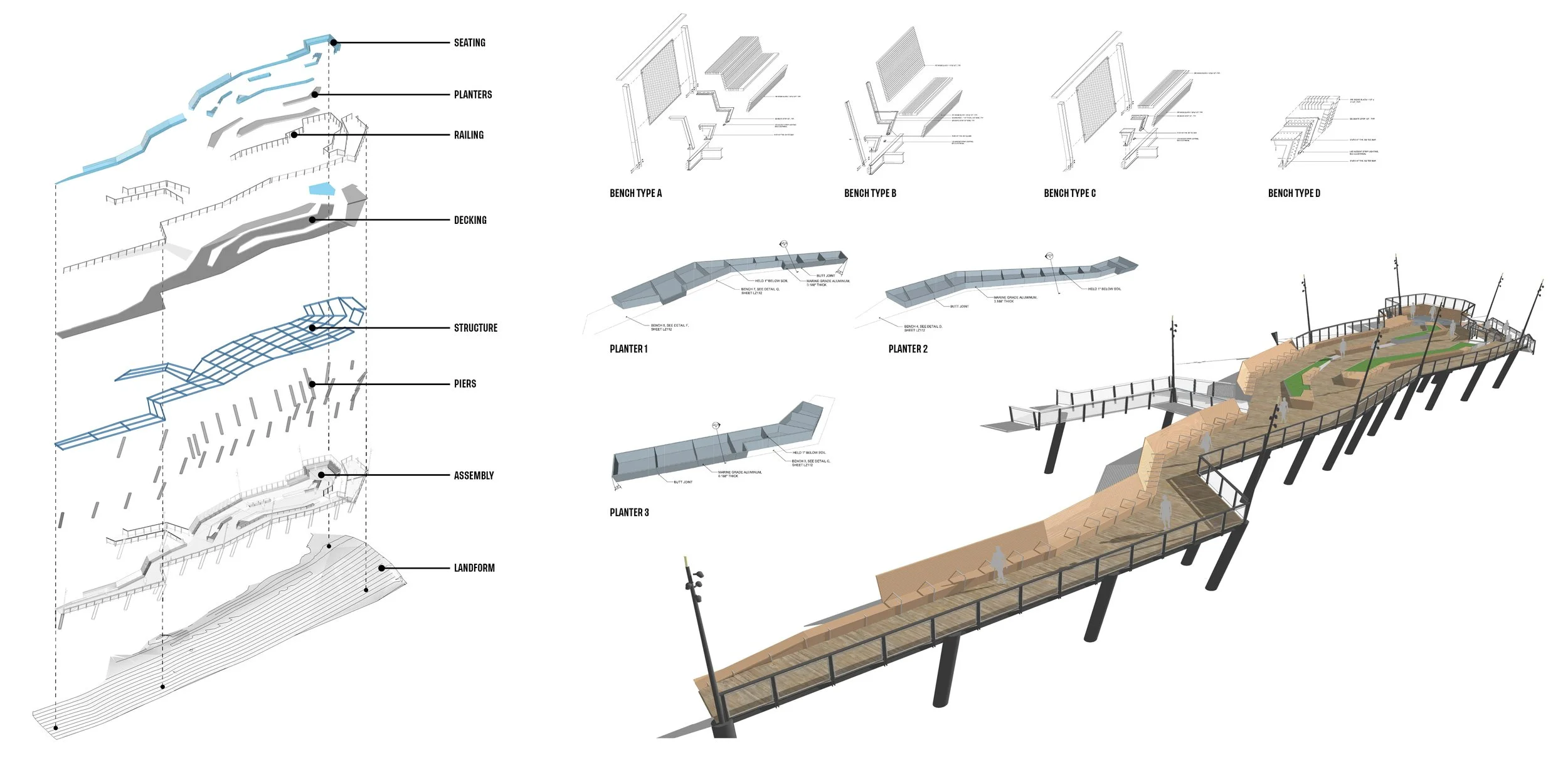 Hovering 25’ above the ground plan, the Riverside Promenade is assembled from a kit of parts: seating, planters, railing, decking, structure, and piers.
