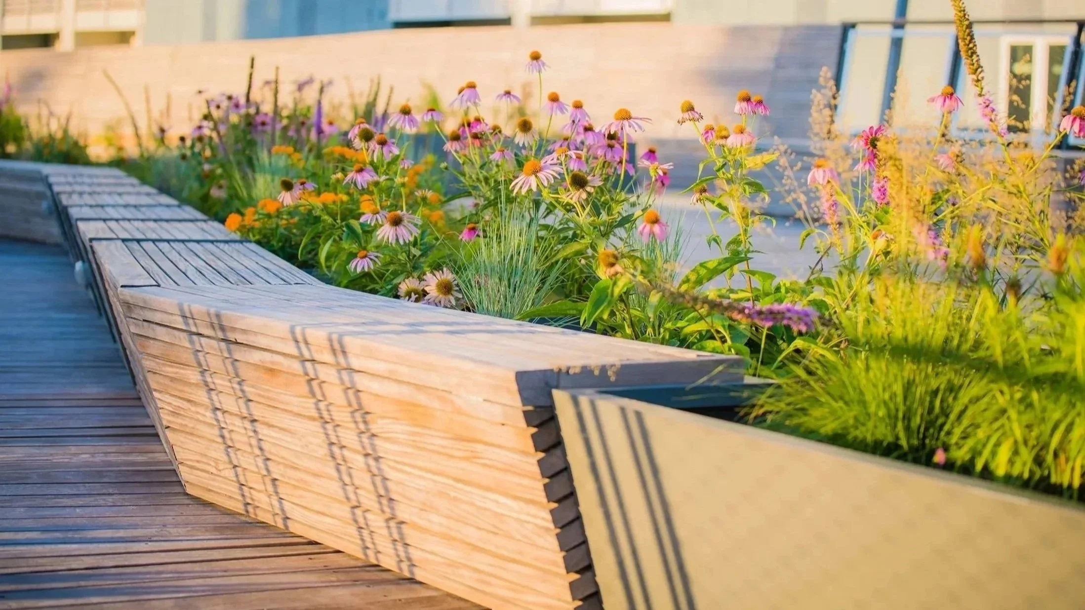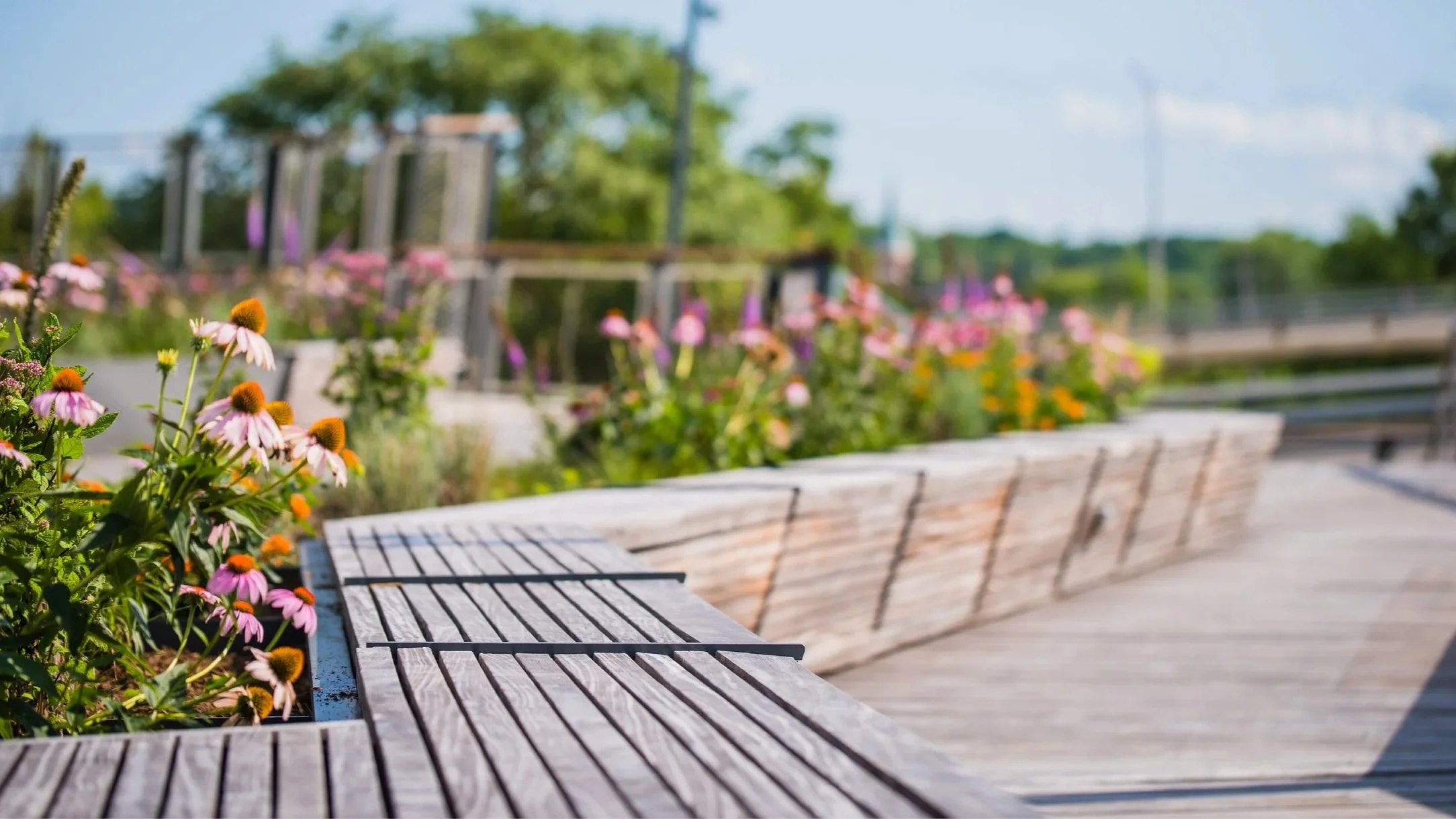 The landscape at both upper and lower levels balances the strong architectural elements. At the platform level, colorful, pollinator-rich plants in elevated planters help define subspaces. Native trees, shrubs, and grasses at the ground plane expand biodiversity, assist with stormwater management, and, when mature, will provide shade to seating areas at the platform level. In several areas at the platform level, metal grating serves as a walking surface, offering views and allowing sunlight to reach the natural landscape below.
