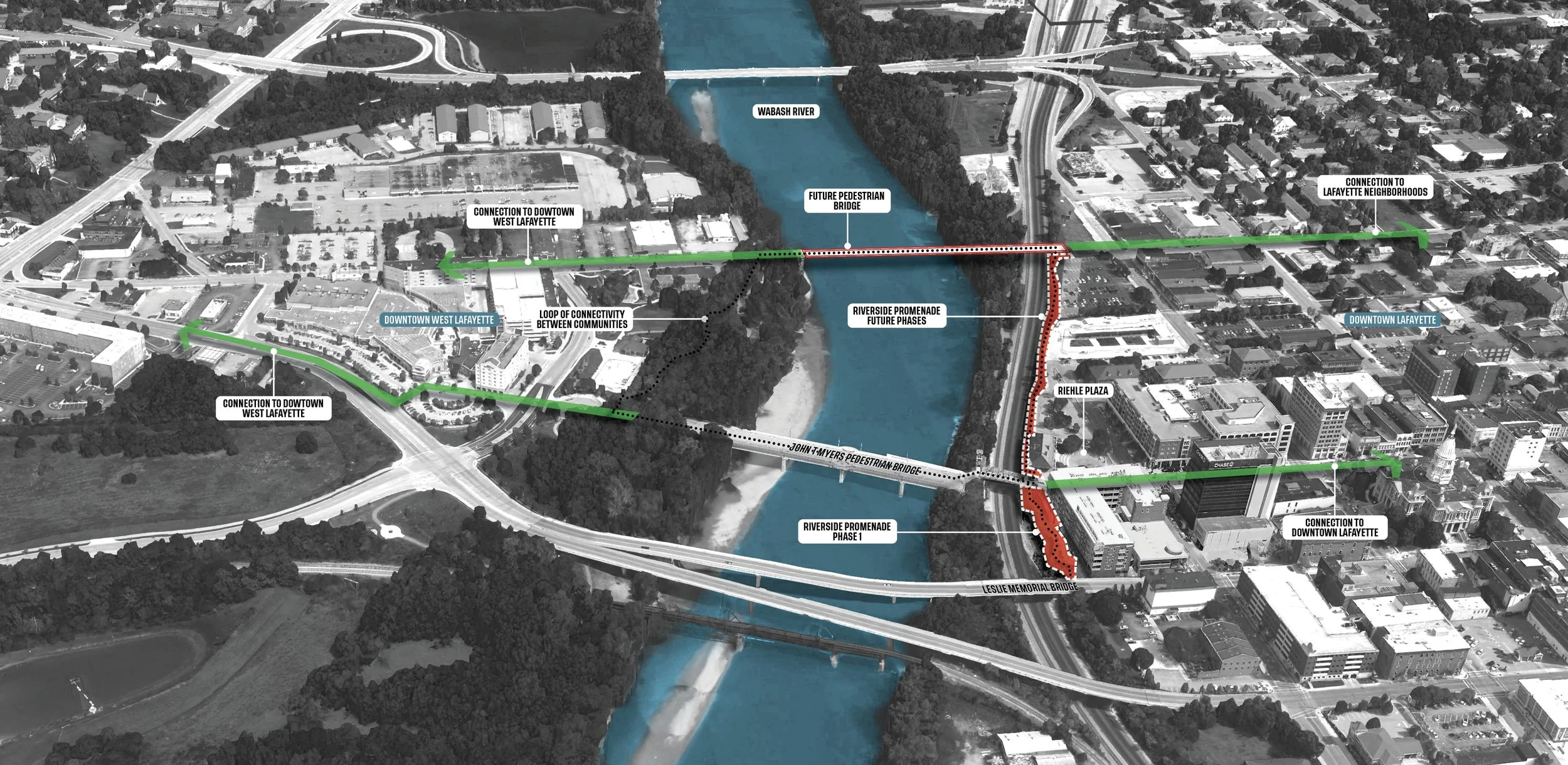 Lafayette and West Lafayette, Indiana, share a complex history with the Wabash River. Once a hub of economic activity via the Wabash & Erie Canal—the longest canal in the Western Hemisphere and, at the time, the second-longest in the world—the river declined in importance with the rise of railroads in the late 1800s. Over time, industrial developments, parking lots, and tow yards isolated it from the cities. In the 1990s, Lafayette relocated downtown rail lines along the riverfront, further severing its connection to the urban core.