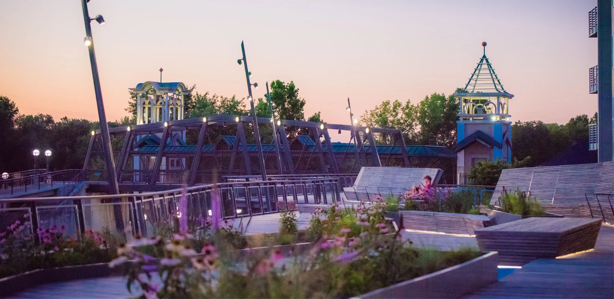As a landmark feature, the Riverside Promenade blends urban and natural elements, providing spaces to walk, sit, and gather. It re-engages residents with the river, demonstrating its renewed role as a center for ecology, transportation, and commerce. The boardwalk hovers 25 feet above grade, offering panoramic river views over adjacent rail lines. Its zig-zagging horizontal form, inspired by the river’s meandering flow, navigates a tight urban space and includes seating areas, overlooks, and small event spaces. Seat backs shift from upright to relaxed, while railings and lighting angle outward by eleven-degrees, giving the impression of a wider space. Materials include regionally sourced steel for the structure, stainless steel railing panels, and sustainably harvested Cumaru wood seating, decking, and rail tops.