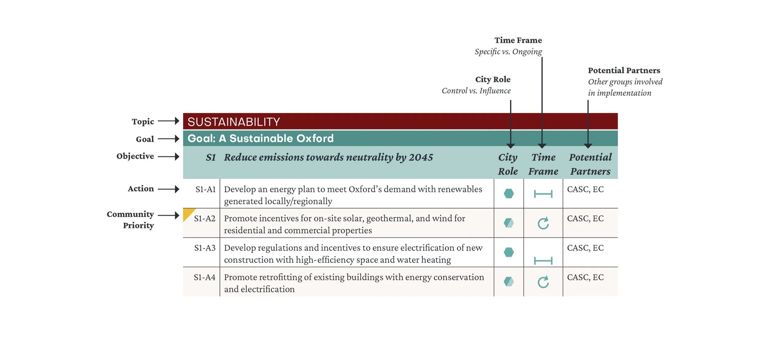 The plan recommendations are summarized into 1 aspirational vision, 8 desired goals, 31 objectives, and 162 concrete actions to shape Oxford over the next ten years and beyond. These actions were then prioritized by the community to provide further guidance to City officials.