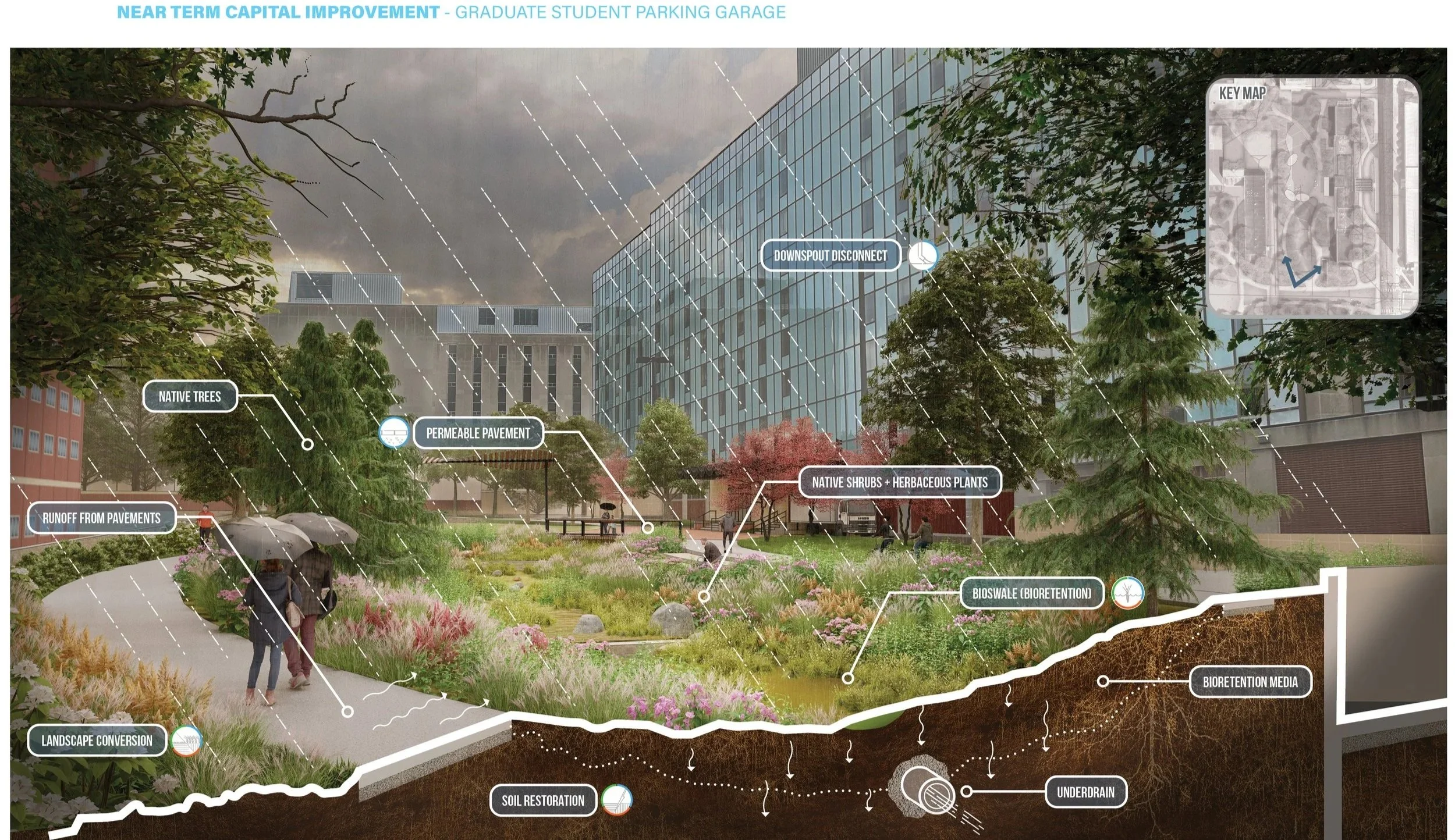 Following the completion of the 2018 Giant Leaps Master Plan, the departments of Campus Planning, Architecture, and Sustainability recognized the need for aligning their current campus-wide stormwater management initiatives with the 50-Year Vision. Similarly, the Physical Facilities 2020 Sustainability Master Plan oriented planned development considerations towards long-term sustainability goals; for instance: developing a strategy to eliminate the combined sewer overflow (CSO). MKSK led a team that included an ecological consultant, to identify opportunities for stormwater and green infrastructure implementation within capital priority projects. The goals therein were to define a strategy for stormwater best management practices (BMPs) at Purdue University and to conceptualize their application across priority campus spaces.