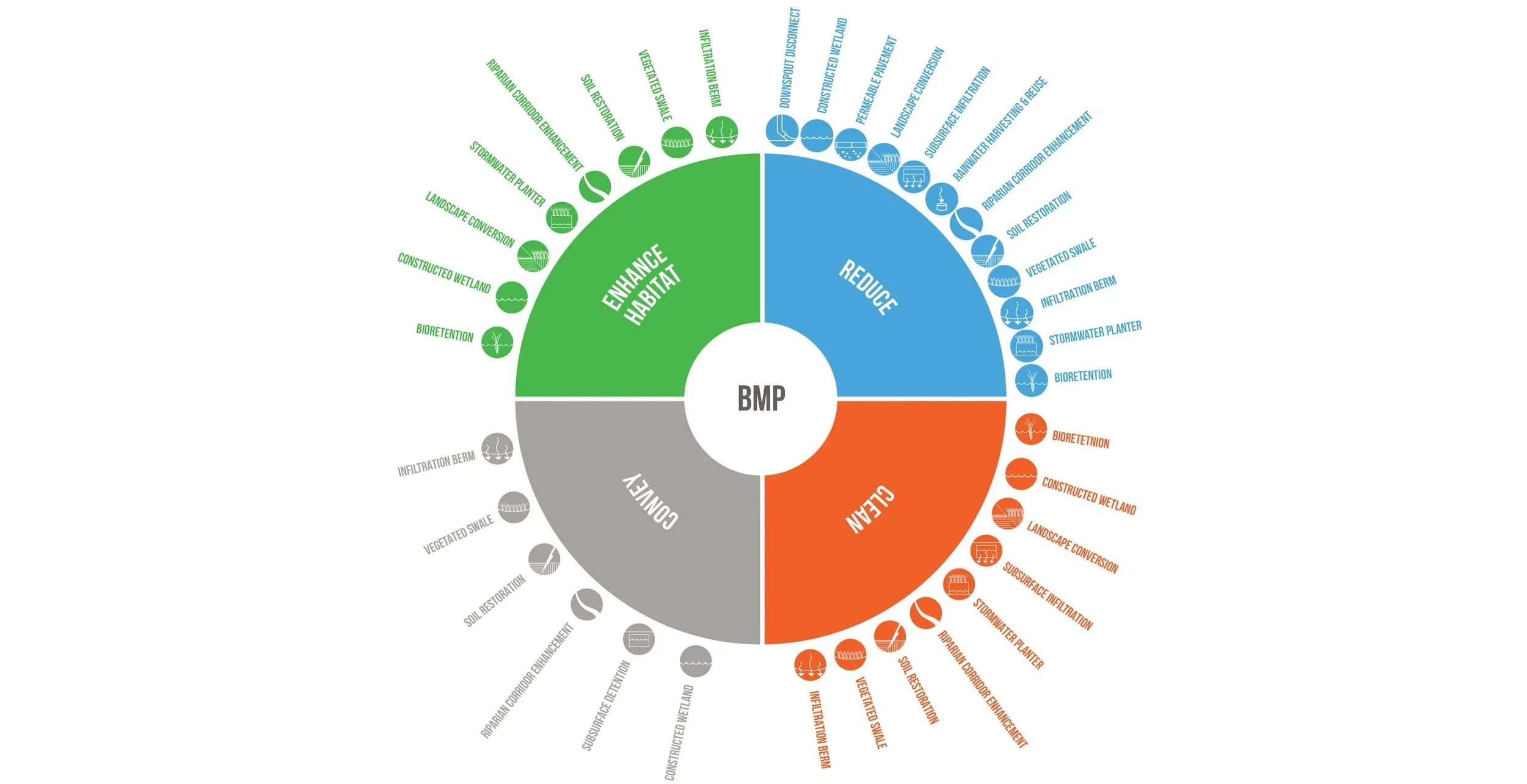The project team worked together to characterize a Stormwater BMP Kit of Parts outlining functional, aesthetic, and feasible value best suited for Purdue University. The BMP functional character chosen, sought out reducing water runoff, cleaning water, enhancing habitat, and providing means of conveyance. The BMP types include: bioretention, rainwater harvesting and reuse, constructed wetlands, permeable pavement, landscape conversion, subsurface detention, subsurface infiltration, stormwater planters, riparian corridor enhancement, soil restoration, vegetated swale, infiltration berm, and downspout disconnect.