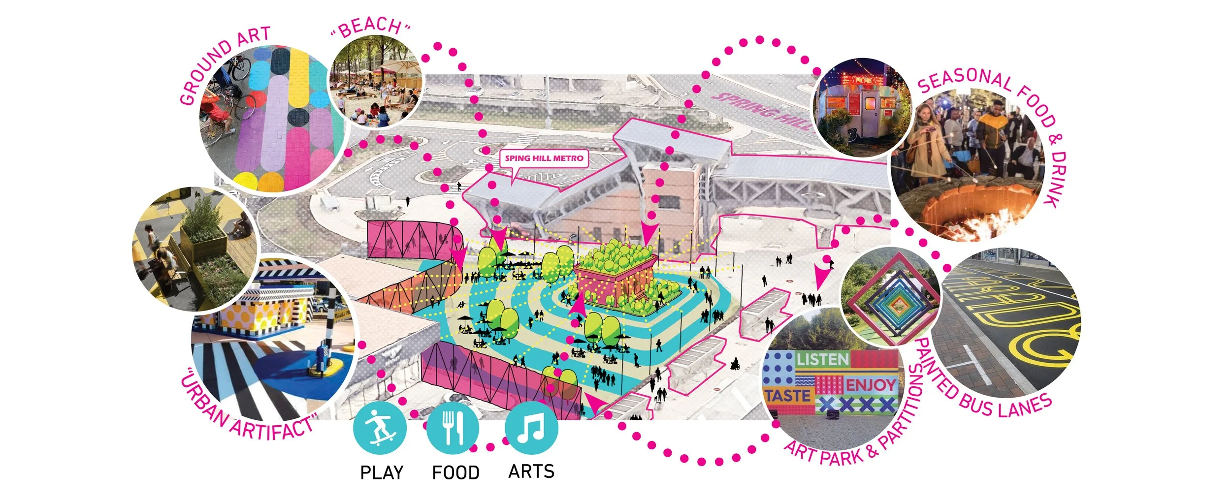 The process began with a series of workshops with diverse stakeholders, including county planning officials, transportation professionals, developers, local businesses, and arts groups. With facilitation by the design team, this core group identified priorities and focus areas in Tysons to maximize activation in the public realm and ultimately develop a coherent framework for the proposed interventions. A targeted workshop was used to gather more specific stakeholder expertise and develop a placemaking “toolbox” – a series of programmatic and conceptual approaches that could be used to activate key sites throughout Tysons.